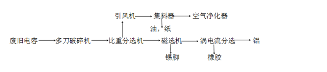 1.多刀破碎機:把廢舊電容進行破碎分解; 2.比重分選機:把破碎后的電容進行風選和比重分選,把油紙分離出來,把鋁、橡膠、電子腳分離出來; 3.磁選機:把比重分選后的物料進行磁選,把電子腳磁選出來; 4.渦電流分選機:把鋁和橡膠分離出來。