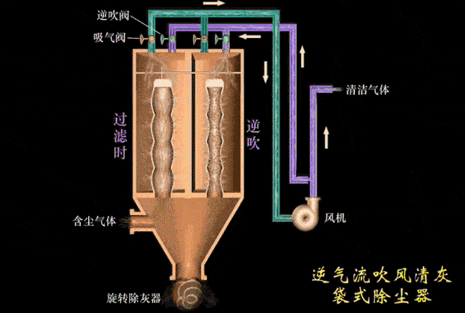 袋式除塵器高的除塵效率是與它的除塵機理分不開的。含塵氣體由除塵器下部進氣管道,經導流板進入灰斗時,由于導流板的碰撞和氣體速度的降低等作用,粗粒粉塵將落入灰斗中,其余細小顆粒粉塵隨氣體進入濾袋室,由于濾料纖維及織物的慣性、擴散、阻隔、鉤掛、靜電等作用,粉塵被阻留在濾袋內,凈化后的氣體逸出袋外,經排氣管排出。濾袋上的積灰用氣體逆洗法去除,清除下來的粉塵下到灰斗,經雙層卸灰閥排到輸灰裝置。濾袋上的積灰也可以采用噴吹脈沖氣流的方法去除,從而達到清灰的目的,清除下來的粉塵由排灰裝置排走。袋式除塵器的除塵效率高也是與濾料分不開的,濾料性能和質量的好壞,直接關系到袋式除塵器性能的好壞和使用壽命的長短。而過濾材料是制作濾袋的主要材料,它的性能和質量是促進袋式除塵技術進步,影響其應用范圍和使用壽命。